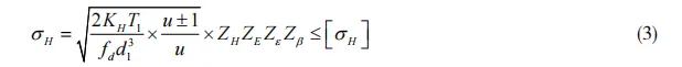 式中:KH為接觸疲勞強度計算的載荷系數;ZH為區域系數;ZE為彈性系數;Zε為重合度系數;Zβ為螺旋角系數。