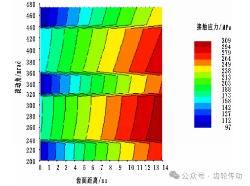 由表3可知,直齒輪的接觸線長度約為75mm,能夠滿足平穩運行的基本要求。根據圖5所示的最大接觸應力,代入相應的參數和表1數據,可得表4接觸應力數據,經過仿真模擬得到的結果如圖6所示。圖6橫軸為齒寬,縱軸為齒輪嚙合的滾動角。從齒輪齒頂與齒根接觸點的結果發現,在大、小齒輪嚙合的過程中,存在偏載現象,造成振動噪音的同時,也使齒輪嚙合時產生沖擊。模型最大接觸應力如表4所示。由表4可知,得到安全系數為1.37,容許最大范圍內接觸應力為550MPa,容許最大范圍內彎曲應力為150MPa。考慮整個機床傳動系統構件有變形的容錯量,此次運行結果符合理論設計值的范圍,齒輪各個應力值均沒有超過許用值,齒輪壽命符合設計預期。綜合分析圖5和表4的結果可以得出,在偏載的情況下,齒輪的設計符合安全和壽命的要求,沖擊問題以及偏載現象可能帶來振動噪聲。