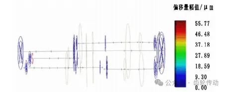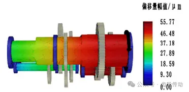 整體模型在1500r/min工況下,對軸1、軸2的偏移變形進行仿真分析,結果如圖7,8所示。由圖8可知,外載荷、床身以及齒輪嚙合共同作用下,軸發生偏移,最大偏移量達55.77µm,偏移主要出現在靠近齒輪一側的齒輪軸端。變形的不均勻導致齒輪右側嚙合而左側分離,加重齒輪的偏載,可能加速齒輪的損壞,也是機床工作不穩定和產生振動的主要原因。因此,在優化設計中需采取措施平衡載荷分布,減少偏載對齒輪的不利影響,如調整床身結構、參數,增強齒輪支撐等。