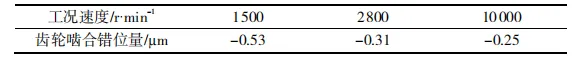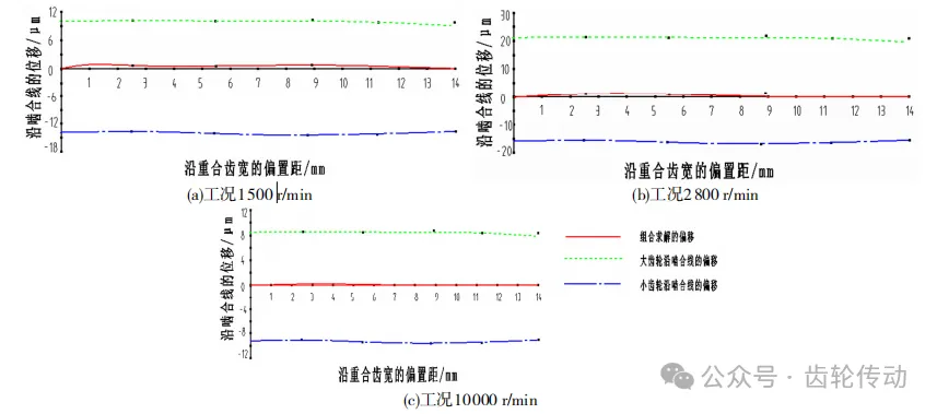 由于在機床齒輪傳動系統中軸承、軸和箱體存在形變,得到嚙合錯位量計算結果如表5所示,齒輪嚙合錯位量如圖9所示。由表5可知,啟動速度為1500,2800,10000r/min時,存在最大嚙合錯位量。圖9中虛線代表大齒輪沿嚙合線的位移錯位量,點劃線代表小齒輪沿嚙合線的位移錯位量,直線代表小齒輪與大齒輪的輪輻組合位移。由于變形的影響,沿著齒寬方向,齒輪右側接觸,左側有分離趨勢,但是偏載不嚴重。