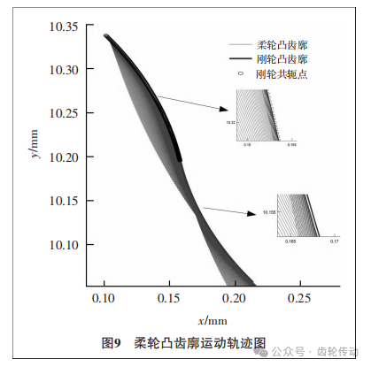 為了分析原始柔輪凸齒廓相對于剛輪的運(yùn)動狀態(tài),直觀地反映裝配后諧波傳動齒廓的嚙合情況,在將柔輪凸齒廓與剛輪凸齒廓分別轉(zhuǎn)換到各自坐標(biāo)系后使用嚙合矩陣Mcf,得到了圖5所示的(0,π)區(qū)間內(nèi)柔輪的運(yùn)動軌跡圖。