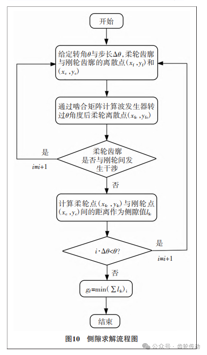 側(cè)隙分析:柔輪的嚙合狀態(tài)的好壞可以大致通過齒廓側(cè)隙這個指標(biāo)來判斷。從側(cè)隙的大小與分布可以初步判斷傳動過程中穩(wěn)定性,齒間載荷分布于是否產(chǎn)生干涉。首先建立側(cè)隙計算模型。通過將齒廓曲線離散成點,求解當(dāng)波發(fā)生器旋轉(zhuǎn)過一定角度下時,每個柔輪齒廓與剛輪齒廓間的最小距離即為側(cè)隙lfc。