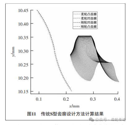 通過圖11的左側(cè)可以看到凸齒廓與凹齒廓間存在空白區(qū)域,這是由于初始映射角非零導(dǎo)致的,因此在最終的齒廓中使用直線過渡段將兩段齒廓連接。因為剛輪與柔輪的凹齒廓是在凸齒廓的基礎(chǔ)上施加間隙調(diào)整量后得到的,因此剛輪與柔輪齒廓在完全嚙合狀態(tài)下間隙均勻穩(wěn)定。