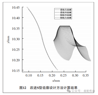 針對現(xiàn)有的S型齒廓修形方法存在的問題,設(shè)計了一種新的齒廓曲線設(shè)計方法。該方法通過使用嚙合矩陣實現(xiàn)共軛點的快速求解,并基于共軛點對齒廓曲線進(jìn)行修形。計算結(jié)果表明,改進(jìn)法設(shè)計下的齒廓相比于傳統(tǒng)S型齒廓具有更小、更均勻的側(cè)隙,嚙合區(qū)間得到增大,傳動誤差有所降低,提高了齒廓的嚙合性能,能夠滿足高精度場合下的使用要求。