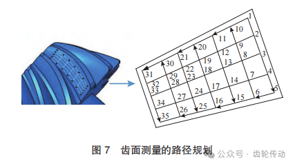 螺旋錐齒輪齒面方程是超越非線性方程,為了讓測量結果盡可能全面地反映實測齒面的形貌信息,對螺旋錐齒輪的齒面進行測量時,通常在軸截面上進行網格規劃。根據螺旋錐齒輪的齒面構造和螺旋線走向, 保證檢測路徑最短且不發生碰撞,本文將小齒輪凹齒面進行網格化,劃分為5×7=35個點,由背錐向頂錐進行“ S”形測量方式獲得齒面測量點數據,如圖7所示。