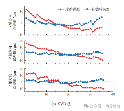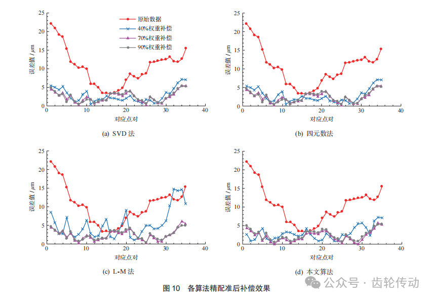 在粗配準之后,將各算法獲取的配準參數值作為精配準的初始參數值。利用點到點 (point-to-point) ICP迭代算法進行精配準,各算法模型中權重k分別等于40%、70%和90%時的補償效果如圖10所示。由圖可知,在實驗的3組不同權重中,各類算法權重系數k=70%時誤差補償效果最佳,k=90%時次之,k=40%時較差。雖然SVD法、四元數法和L-M法對齒面誤差均有補償作用,但本文算法最終的補償效果更好,且最終誤差更小。