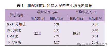 表1為粗配準前后的最大誤差與平均誤差數據。由表可知,4種算法的最大誤差分別降低了16.20、15.76、13.39和16.24μm,平均誤差分別降低了7.33、7.14、 6.80和7.88μm,本文算法相比于其他算法的結果更優。