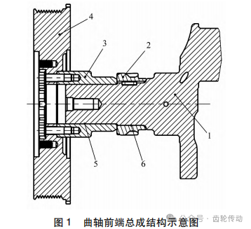 如圖1所示,本文以非道路柴油機(jī)用曲軸飛輪總成為案例進(jìn)行闡述和分析,曲軸前端總成包括:1、曲軸前端,2、曲軸齒輪,3、輪轂,4、減振皮帶輪,其中在曲軸前端上布置有小軸頸5(直徑φ54)、大軸頸6(直徑 φ58)等。