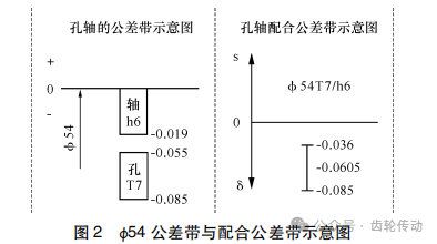 輪轂與小軸頸、減振皮帶輪的精度設(shè)計(jì):如圖1所示,曲軸齒輪套裝在大軸頸上,輪轂再套裝在小軸頸上,為避免熱壓裝配過(guò)程中對(duì)結(jié)合面的損傷,大小軸頸的截面做成階梯狀,可以使曲軸齒輪順利穿過(guò)小軸頸,為此選擇小軸頸的直徑為φ54。作為轉(zhuǎn)接件,輪轂起著連接曲軸前端與減振皮帶輪的橋梁作用,可以減少曲軸種類(lèi)、降低工藝復(fù)雜性,以及更好的適應(yīng)減振皮帶輪的多樣性。考慮前端附件的負(fù)載功率、配套輪轂的多變性和曲軸小軸頸的統(tǒng)一性,可采用基軸制配合,選擇輪轂過(guò)孔與小軸頸的配合代號(hào)為φ54T7/h6,它比較接近于重型壓配,可產(chǎn)生相當(dāng)大的結(jié)合力,同樣采用熱壓裝配工藝。輪轂要求在溫度為400℃加熱爐中,保溫30min,熱壓到曲軸前端,壓至與曲軸齒輪貼合。圖2所示為輪轂過(guò)孔與小軸頸的公差帶與配合公差帶示意圖,s表示間隙,符號(hào)為正;δ表示過(guò)盈, 符號(hào)為負(fù)。它的選擇邏輯如下: