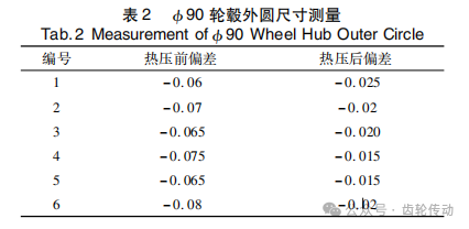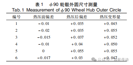 (2)沒(méi)有受到任何約束,即可以自由膨脹或收縮。在本文中,在將輪轂熱壓裝配到小軸頸后,接下來(lái)進(jìn)行的冷卻收縮過(guò)程,顯然不是自由收縮過(guò)程,它受到了小軸頸的阻礙作用,形成了所謂的過(guò)盈配合。那么,這就意味著輪轂上φ90h6的尺寸,在經(jīng)過(guò)熱壓裝配后會(huì)被脹大,結(jié)果就會(huì)導(dǎo)致減振皮帶輪止口處裝配困難,也就是出現(xiàn)了軸大孔小不容易裝配的情況。實(shí)際上,輪轂外圓與減振皮帶輪的止口按φ90H7/h6加工后,在生產(chǎn)過(guò)程中確實(shí)發(fā)生了裝配困難的現(xiàn)象,圖紙上輪轂φ90h6的公差帶為[-0.022~0],熱壓裝配前后測(cè)量相關(guān)數(shù)據(jù)如表1所示。熱壓前外圓直徑偏差測(cè)量數(shù)據(jù)均在公差[-0.022~0]的區(qū)間范圍內(nèi),熱壓后外圓直徑全部超差,熱壓變形量為+0.045~+0.055之間。通過(guò)圖2我們可以知道,φ54T7/h6配合的平均過(guò)盈為-0.0605。為補(bǔ)償熱壓變形量,將輪轂Ф90h6的上下極限偏差均減小0.06,這時(shí)極限偏差修正為[-0.082~-0.06],保持減振皮帶輪止口φ90H7不變。按這個(gè)修正公差帶再次加工并裝車(chē)驗(yàn)證,之前裝配困難的問(wèn)題得到了順利解決。