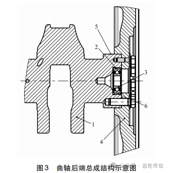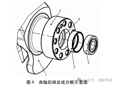 如圖3所示,曲軸后端總成包括:1、曲軸后端,2、擋環(huán),3、滾動(dòng)軸承,4、飛輪,其中在曲軸后端還布置有后軸頸5(直徑φ54)、后端內(nèi)孔6(直徑φ52)等。