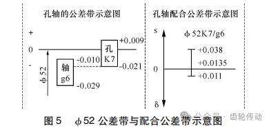 按軸承外殼孔的要求,公差等級(jí)IT7,并根據(jù)實(shí)踐經(jīng)驗(yàn)確定 后端座孔的公差帶代號(hào)為φ52K7[-0.021~+0.009],將其以圖形的形式表示在圖5中。