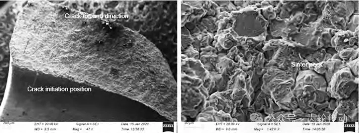 材料性能:據相關要求,齒轂零件的表面硬度要求最小為280 HV5,芯部硬度要求最小為200 HV5,密度必須大于等于7.0g/cm3 。對失效齒轂零件進行檢測,檢測的表面硬度296 HV5,芯部硬度210 HV5,密度7.1g/cm3 , 均在設計要求的范圍內,表明硬度和密度均符合要求。對斷裂碎片和齒轂上進行電鏡掃描分析,如圖2所示,在裂紋的初始位置和裂紋擴展方向,可以發現裂紋上有燒結頸,由此判斷齒轂零件本身并不存在原始裂紋。