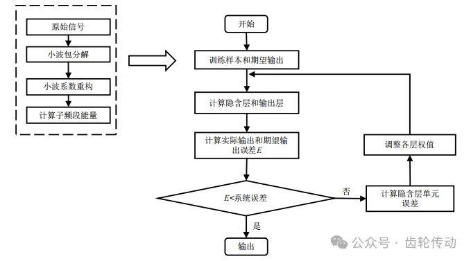基于BP神經網絡的故障診斷:在基于BP神經網絡的故障診斷模型中,確定神經網絡的結構和每層的神經元節點數是至關重要的步驟。根據前面的分析,輸入層的節點數被設定為8,這一設置與特征向量的維度一致,確保了所有輸入數據特征能夠被網絡有效接收和處理。輸出層的節點數設置為4,代表了不同的故障類別,使得網絡能夠對不同類型的故障進行分類。隱含層的節點數則根據經驗設定為20,這一選擇旨在提供足夠的網絡容量來捕捉和學習復雜的特征模式和非線性關系。隱含層的節點數對于網絡的學習能力和泛化能力至關重要,能夠幫助網絡更好地適應訓練數據并提高對新數據的識別準確性。圖4展示了該模型的詳細算法流程,清晰地描繪了數據在網絡各層之間的傳遞和處理過程。這些信息有助于理解網絡的工作機制及其在故障診斷中的應用。通過這種精心設計的網絡結構,可以有效提升模型的性能,確保故障診斷的準確性和可靠性,同時為實際工程應用奠定堅實的基礎。