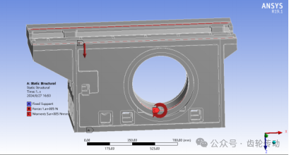 立柱結構與床身之間通過10個螺栓固定形成剛性連接,立柱與床身之間的接觸變形相對于整個計算結果的影響是可以忽略的,同時本文也不考慮阻尼和 慣性的影響。因此,認為立柱結構的螺栓結合面就是一個全約束。根據H150G數控螺旋錐齒輪加工機床的實際工作情況,立柱結構約束的邊界條件及相應坐標系如圖4所示。同時,在導軌面上施加水平的均布載荷,在B軸安裝面施加扭矩。
