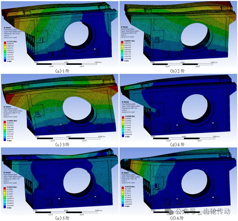 利用有限元軟件ANSYS Workbench,根據上述公式,分析前6階振型及相應的振動頻率。