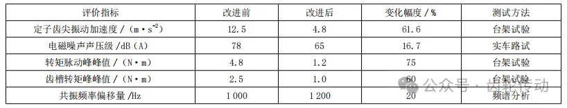 影響分析:由上述分析可以看出,驅動電機在運行中存在高頻振動現象,尤其是定子齒尖區域,能夠產生頻率介于400~2000Hz的高頻電磁力,激勵定子鐵芯和殼體振動,同時有高頻嗡嗡聲或嘯叫聲出現,該現象在電機高轉速狀態下更為顯著。在上述激勵作用下,副車架或懸架系統極有可能引發共振,儀表盤和車門飾板可能出現異響現象。齒槽轉矩基波頻率為280Hz,轉矩峰峰值為2.5N·m,占額定轉矩的3%。這種周期性轉矩波動會導致電機輸出軸產生低頻扭振現象,在車輛加速或勻速行駛時,可能會引發傳動系統抖動和車內部分位置明顯振感,被駕駛員感知為“頓挫感”,影響駕駛舒適性。轉矩脈動會導致電機輸出轉矩周期性波動,再通過齒輪嚙合傳遞至減速器,由此引發齒輪箱的齒頻振動,產生尖銳噪聲。