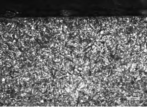 熱處理金相組織:齒輪鋼通常采用滲碳工藝,以20MnCr5為例,在常規熱處理之后,表層組織具有一定強度硬度和耐磨性,心部組織具有一定韌性,有助于分擔緩沖齒輪表面受力。圖5和圖6為零件滲碳淬火后的金相組織圖,其中圖5為節圓表面組織,圖6為心部組織。