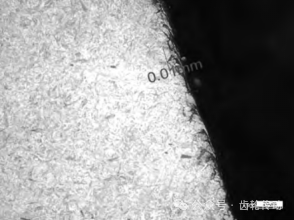 過渡區氧化層厚度:過渡區表面內氧化及非馬組織形貌內氧化層厚度,一般為0.01~0.02mm左右。由于鋼中的鉻和錳極易被氧化,當氧從鋼的表面侵入時,晶界附近的鉻和錳便較其它元素優先擴散至晶界與氧結合而形成氧化物,這種氧化層一般稱之為內氧化,其存在會降低表面硬度、耐磨性及抗疲勞性能,特別是彎曲疲勞強度。非馬組織、內氧化的測量和判定可以依據汽車行業標準QC/T262, 本文作者所在單位也參與修訂了QC/T262, 根據實際行業生產與檢測的情況,對舊版標準做了較大幅度地更新。圖7為過渡區氧化層厚度。