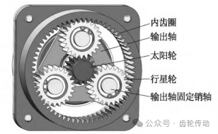 小模數(shù)行星減速器的基本原理:小模數(shù)行星減速器是一種由太陽輪、多個行星齒輪以及一個內(nèi)齒圈共同協(xié)作實現(xiàn)減速效果的機(jī)械裝置。某行星減速器結(jié)構(gòu)示意圖如圖1所示,太陽輪和行星輪之間的嚙合使得行星輪隨之旋轉(zhuǎn),并繞行星架旋轉(zhuǎn),將輸入軸的高速旋轉(zhuǎn)轉(zhuǎn)變?yōu)檩敵鲚S的低速旋轉(zhuǎn),并起到增大扭矩的作用。輸入軸與太陽輪采用一體式設(shè)計或者機(jī)械固定方式,行星輪個數(shù)為3個,其在自轉(zhuǎn)的同時也圍繞行星架公轉(zhuǎn),所以其承載能力強(qiáng)、傳動精度高、傳動比大。
