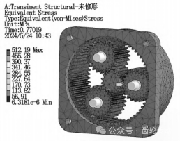 利用有限元軟件ANSYS Workbench對行星輪系進(jìn)行仿真分析, 對模型進(jìn)行簡化處理并進(jìn)行網(wǎng)格劃分,太陽輪、行星輪和內(nèi)齒圈的齒面都經(jīng)過了加密處理,具體的網(wǎng)格劃分情況如圖2所示。隨后,設(shè)定約束和接觸條件,對內(nèi)齒圈進(jìn)行固定,太陽輪繞中心旋轉(zhuǎn),行星輪相對輸出軸上的固定銷軸轉(zhuǎn)動,輸出軸相對中心軸線轉(zhuǎn)動,太陽輪與行星輪齒面、行星輪與內(nèi)齒圈齒 面摩擦接觸。求解得到瞬態(tài)動力學(xué)分析結(jié)果,獲取到在額定工況下齒輪齒面的應(yīng)力分布情況,如圖3所示。其中最大應(yīng)力出現(xiàn)在與太陽輪嚙合的行星輪齒根處,最大應(yīng)力σmax=512.19MPa, 20CrMnTi的屈服強(qiáng)度為850MPa , 安全系數(shù)為1.66。