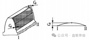 齒向修形有多種方式,包括齒向折線梯形修形、齒向圓弧梯形修形、齒向螺旋線修形、齒向鼓形修形、齒向三角修形以及齒向扭曲修形。圖5為齒向鼓形修形示意圖,Cβ為齒向鼓形量。