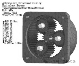 齒輪修形生成新的太陽輪、行星輪和內(nèi)齒圈,然后得到新的行星輪系模型。本文采用有限元軟件ANSYS Workbench對該行星輪系進(jìn)行瞬態(tài)動力學(xué)分析,以快速驗證齒輪修形后的效果,此方法不僅可以節(jié)約時間成本,對于方案快速迭代也非常有利。對模型的網(wǎng)格劃分、施加約束與邊界條件等與優(yōu)化前相同,分析后獲得了行星輪系嚙合齒處的應(yīng)力分布圖,如圖7所示。其中最大應(yīng)力出現(xiàn)在與太陽輪嚙合的行星輪齒根處,其最大應(yīng)力σmax=428.15MPa, 20CrMnTi的屈服強(qiáng)度為850MPa, 安全系數(shù)為1.99。 其承受的最大應(yīng)力降低了16.4% , 在材料一定的情況下,經(jīng)過齒輪修形的行星減速器其承載能力更強(qiáng)。
