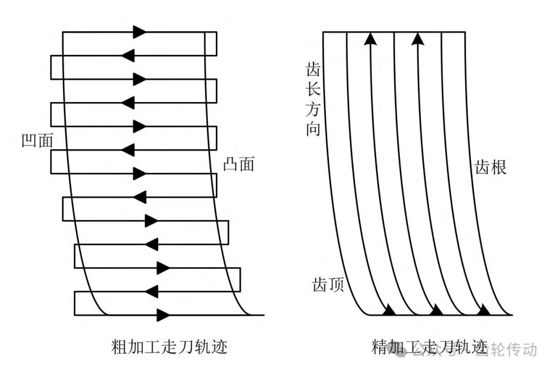從表3可以看出,為探究切削力、切削速度和進給量這三個高速切削工藝參數與弧齒錐齒輪硬齒面表面質量之間的關系,本次試驗采用了三因素六水平正交試驗方法。具體試驗步驟如下:首先開啟機床,控制弧齒錐齒輪工件移動至與刀具相對的正確位置上,按試驗方案中設計的切削工藝參數進行齒輪的粗加工。這里主要采用雙向行切法,也就是控制刀具從弧齒錐齒輪的毛坯工件上端的凹面處進刀,繞著工件圓周方向進行切削,直至走到下一齒的凸面,完成一個齒長的切削,不斷循環,直至完成全部齒槽的粗加工后停止。然后在弧齒錐齒輪工件熱處理后,再對齒輪進行精加工。這里主要采用了豎向雙向行切法,也就是按照與粗加工不同的走刀路徑,同樣對弧齒錐齒輪工件進行由凹面到凸面的切削加工,最終得到弧齒錐齒輪硬齒面的實際切削效果。在本次試驗過程中,弧齒錐齒輪硬齒面的粗加工與精加工軌跡如圖1所示。表面質量之間的關系,本次試驗采用了三因素六水平正交試驗方法。具體試驗步驟如下:首先開啟機床,控制弧齒錐齒輪工件移動至與刀具相對的正確位置上,按試驗方案中設計的切削工藝參數進行齒輪的粗加工。這里主要采用雙向行切法,也就是控制刀具從弧齒錐齒輪的毛坯工件上端的凹面處進刀,繞著工件圓周方向進行切削,直至走到下一齒的凸面,完成一個齒長的切削,不斷循環,直至完成全部齒槽的粗加工后停止。然后在弧齒錐齒輪工件熱處理后,再對齒輪進行精加工。這里主要采用了豎向雙向行切法,也就是按照與粗加工不同的走刀路徑,同樣對弧齒錐齒輪工件進行由凹面到凸面的切削加工,最終得到弧齒錐齒輪硬齒面的實際切削效果。在本次試驗過程中,弧齒錐齒輪硬齒面的粗加工與精加工軌跡如圖1所示。