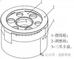 擺線輪的外協(xié)最后一道工序為熱處理,粗加工給精加工的端面預留量為0.1mm,由于熱處理后工件會不可避免的發(fā)生變形,如果精加工采用直接吸在磨床上進行平磨,會導致工件的形位公差超差,進而影響后續(xù)的工序加工。因此,需要設計一套工裝(圖3)來完成此工序的加工。此工裝利用標準的三爪卡盤改造,只需更換特制的卡爪即可,擺線輪在裝夾時,需保證每個卡爪的圓弧面與2個以上的擺線齒接觸。圖中的調(diào)整塊可以快速的調(diào)整擺線輪裝夾時的平面度,擺線輪夾緊后取掉調(diào)整塊進行磨削加工。工裝的夾緊力控制在5N·m,工件在裝夾后幾乎不會發(fā)生彎曲變形,可以保證擺線輪在第一面磨削完成松開后,加工面不會發(fā)生彎曲變形,磨第二面時便可以將第一面直接吸在磨床平臺上即可,不需要互為基準的多次磨削。要求平磨后擺線輪兩平面的平行度為0.01mm。