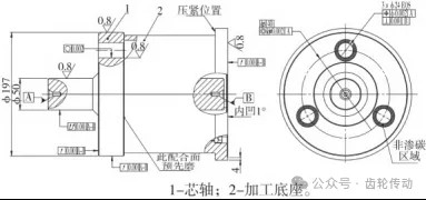 磨齒工裝芯軸的粗加工和熱處理采用外協(xié)的方式完成,公司內(nèi)部只完成芯軸的精加工,芯軸的精加工也是擺線輪工藝裝備中最關鍵的一環(huán)。芯軸材質(zhì)為低碳鋼,熱處理工藝采用滲碳淬火+低溫回火,熱處理后要求表面硬度為58~62HRC,芯部硬度為30~45HRC,滲碳時需要對孔及其周圍的區(qū)域(比孔最終尺寸+φ4mm)進行防護,目的是熱處理后需要鏜孔加工的區(qū)域的表面硬度與芯軸內(nèi)部保持一致,精加工時有利于保證加工質(zhì)量,加工完成后孔周邊的表面硬度還可以滿足工裝的使用。芯軸本體的形狀不便于進行鏜孔加工,因此精加工時還需設計一個芯軸加工底座,來輔助完成芯軸鏜孔時的定位裝夾。芯軸粗加工完成到貨后,先將其中心孔精研,提高定位基準的質(zhì)量,因后續(xù)的工裝加工以及擺線輪加工都是以中心孔為基準。將芯軸與底座的配合面精磨,要求對中心孔的跳動≤0.001mm,然后與底座安裝在一起后進行精加工(圖7)。 圖中的關鍵尺寸按圖所示加工。為了防止芯軸在鏜孔夾緊時發(fā)生變形導致加工精度超差,底座底部設計并非是一個大的圓環(huán)面,而是設計為半徑方向厚4mm左右的圓環(huán)狀,并且要精磨成內(nèi)凹的形狀。這種設計是為了保證在壓緊時工裝與機床工作臺面為線接觸,這樣芯軸在夾緊后不會發(fā)生變形。