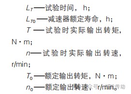 GB/T37718—2019規定減速器的額定壽命不低于6000h。這是絕大多數減速器的額定壽命,也是整機OEM要求的減速器工作時間,因此油品測試周期應滿足減速器6000h壽命要求。同時該標準中規定了對應6000h壽命的臺架試驗時間——減速器當量壽命的計算方法,可據此結合臺架實際參數計算出試驗時間。其當量壽命(即試驗時間)按照下述公式計算: