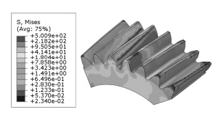 以主動輪為例,逐個增量步地查看中間輪齒從嚙入到嚙出的完整過程可知,細高齒主動輪齒根最大彎曲應力為500.9MPa,如圖3(a)所示