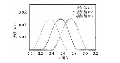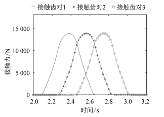 重合度是用來表示齒輪傳動過程中同時參與嚙合的輪齒對數的平均值。若已知單對輪齒發生接觸時間為ΔT和相鄰兩對輪齒開始進入嚙合的時間差為Δt,則重合度可以表示為ΔT/Δt。齒輪承載后發生彈性變形會使得實際重合度大于利用公式算得的幾何重合度。從歷史變量輸出結果中提取中間三個輪齒接觸力隨時間的變化數據得到齒面接觸力變化曲線(見圖5),計算出細高齒和常規齒齒輪副的實際重合度分別為3.43、2.95。細高齒單齒最大嚙合力為12343N,較常規齒的13883N降低了11.09%。