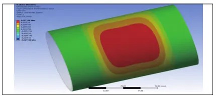 建立膨脹套有限元分析模型。采用Ansys有限元軟件,根據膨脹套具體工況進行加載和邊界約束,對膨脹套左右兩端進行固定約束,中間內筒部分施加式(3)計算得到的內部工作壓力為10.34MPa,圖2為等效應力云圖,圖3為徑向變形云圖。