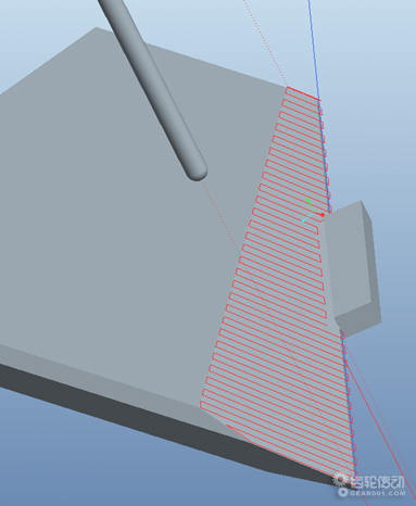 在斜面加工時(shí),若采用圖3.1所示的橫向水平走刀,每一段走刀距離都很短,在切削過程中主軸需要頻繁換向,切削穩(wěn)定性差。且由于切削的是斜面,水平走刀需要X或Y軸與Z軸的聯(lián)動(dòng),不利于切削速度的提升。因此,針對(duì)此類斜面加工,走刀軌跡盡量安排為平行于最長斜邊(如圖3.2),不但走刀軌跡最長、換向次數(shù)最少,而且單道走刀都只是在XY平面運(yùn)動(dòng)切削,Z軸方向運(yùn)動(dòng)都是安排在工件輪廓之外的位置,即使在高速切削下亦可減小刀具損傷。