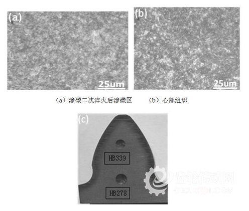 完成低溫回火工序后剖切檢驗齒輪。金相組織如圖3所示,齒輪滲碳區組織為:回火馬氏體+殘留奧氏體1級,少量碳化物1級,晶粒度9級。心部組織為:回火索氏體+少量鐵素體,晶粒度8級;心部硬度278~339HBW,滿足工藝要求。