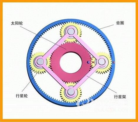 行星齒輪機構由太陽輪(中心輪)、行星齒輪、行星齒輪架(行星架)、齒圈等組成,為軸轉式齒輪系統(tǒng),與定軸式齒輪系統(tǒng)一樣,也可以實現變速與變矩。它的運轉遵循一個行星齒輪機構運動特性方程: