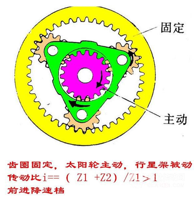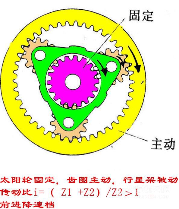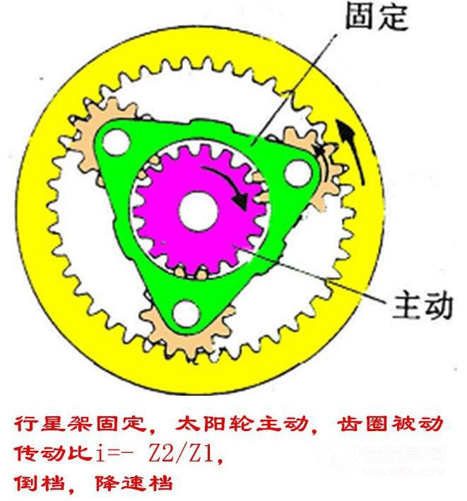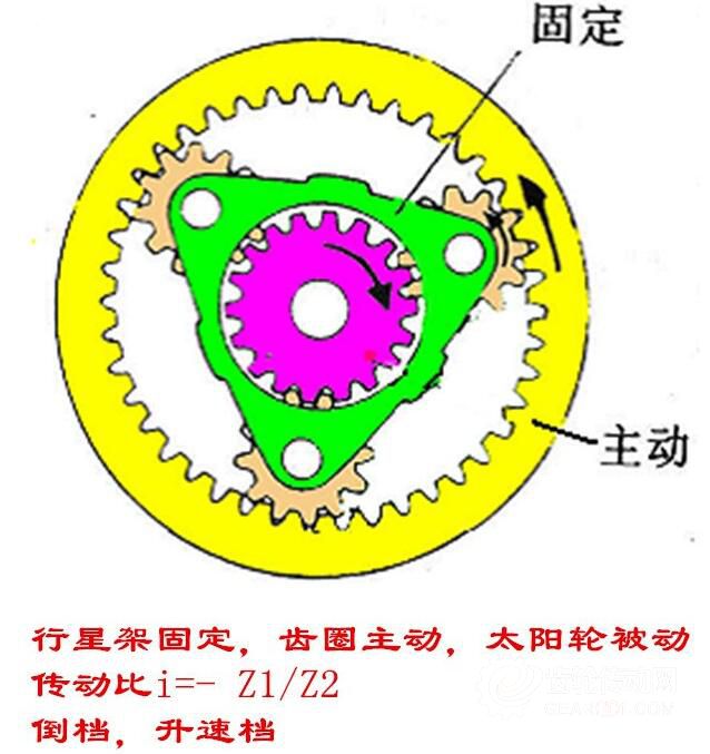 此種組合為降速傳動,傳動比一般為1.5~4,轉向相反。為倒檔,降速檔。