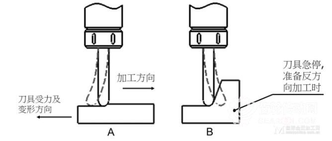 如下圖所示,A圖是刀具在加工較平坦位置時(shí)的狀態(tài),當(dāng)加工到B位急停,準(zhǔn)備反向加工時(shí),由于慣性作用,刀具會(huì)產(chǎn)生變形,從而造成在B位較直身位處彈刀過(guò)切。