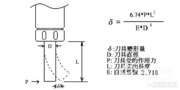 由公式可知,刀具的變形量與刀具直徑是4次方的關(guān)系,同樣長(zhǎng)度的刀具,當(dāng)?shù)毒咧睆綔p少一倍,其變形量將會(huì)增大4倍。