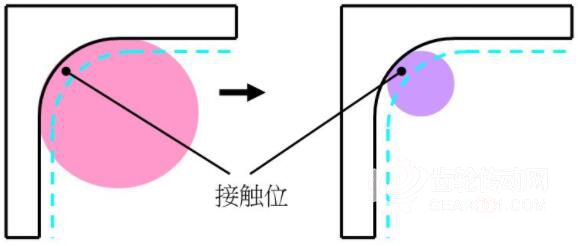 下圖是使用D50R6刀和D50R0.8刀在加工同樣深度時(shí),與模料接觸位的比較可知,采用細(xì)R角刀具加工深型工件比大R角刀具更能減少切削力。