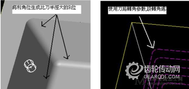 使用刀路轉(zhuǎn)角功能或加大R位的方法來(lái)減少刀具在轉(zhuǎn)角位的負(fù)荷,從而降低彈刀的機(jī)率。