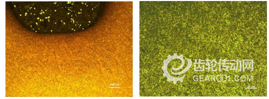 對缺陷零件進行熒光磁粉探傷檢查,在局部齒根處可見細微的熒光磁粉顯示。缺陷顯示位置相同,形貌相似,如圖1、圖2所示。其余表面均未發現磁痕顯示。