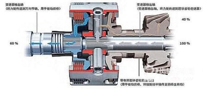 當后軸車輪附著力降低時,冠狀齒輪差速器會將最多70%的扭矩傳遞至前軸。