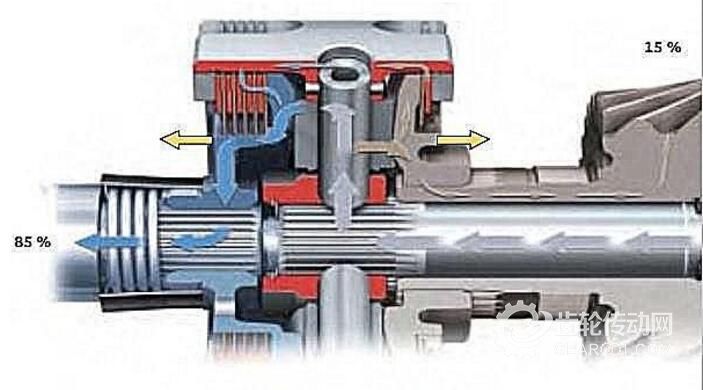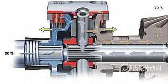 由于兩個冠狀齒輪設計的工作力臂不同,約為40:60,根據公式:力矩=力*力臂,則力矩比約為60:40(扭矩是使物體發生轉動的一種特殊的力矩),即傳遞至后軸的扭矩為60%,傳遞至前軸的扭矩為40%。當兩個冠狀齒輪出現轉速差時,四個行星齒輪就會進行自轉,帶動兩個冠狀齒輪轉動,由于冠狀齒輪的特殊幾何結構,行星齒輪會迫使冠狀齒輪產生軸向力,這個軸向力便會使冠狀齒輪產生軸向位移壓緊多片式離合器,使多片式離合器產生接合力矩,改變前后軸的扭矩分配(分配比例由冠狀齒輪的幾何特性決定).