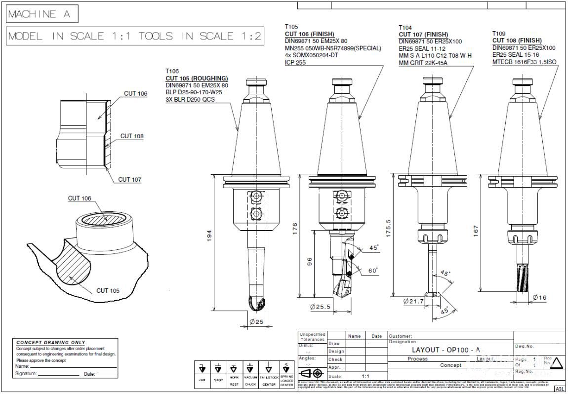 刀具已完全組裝裝配,附上調(diào)整用及所有單獨(dú)使用的工具以及裝配圖和刀具布局圖紙。若用戶(hù)需要,每一組件均可配備電子傳感器用于數(shù)據(jù)管理。