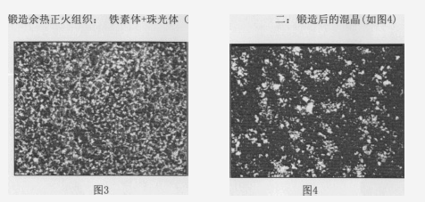 通過恰當的余熱正火工藝,可使45或40Cr等鋼鍛后直接獲得均勻的鐵素體加珠光鐵,使其組織更細,晶粒得到細化(5~8級)見圖3和圖4,因此,壽命提高一倍以上。