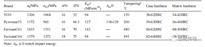 表 4 9310、Pyrowear 53 和 Ferrium C61 常規熱處理后的室溫力學性能