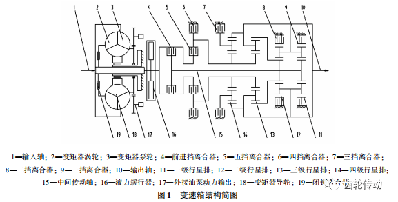 圖 1 所示為變速箱結(jié)構(gòu)簡圖。液力變速箱主要包括液力變矩器、液力緩行器、六組濕式離合器和四組行星排、雙聯(lián)泵及液壓附件等元件, 動力由前端輸入軸 1 到變矩器渦輪 2 和變矩器泵輪 3,經(jīng)過液力緩行器 16 傳遞到前進擋離合器 4,經(jīng)過中間傳動軸 15 將動力傳遞到行星齒輪排 (以下簡稱行星排) (11 ~ 14),由壓力油驅(qū)動控制不同的擋位離合器 (5 ~ 9),可以使相應(yīng)的行星齒輪副動作,輸出 5 個前進擋和 1 個倒退擋,最終由輸出軸 10 輸出動力。
