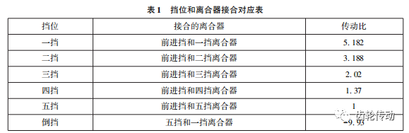 變速箱換擋裝置采用行星齒輪傳動和濕式離合器結(jié)構(gòu),共有 4 套行星排 (11 ~ 14) 和 6個離合器 (4 ~ 9),每套行星排包括 1 個太陽輪、4 個行星輪 (構(gòu)成行星輪架) 和 1 個內(nèi)齒圈。動力由中間傳動軸可以傳遞到三、四級行星排的太陽輪,通過不同離合器的接合,控制行星排中的構(gòu)件,以不同速度的輸出動力。擋位和離合器接合對應(yīng)表如表 1 所示。